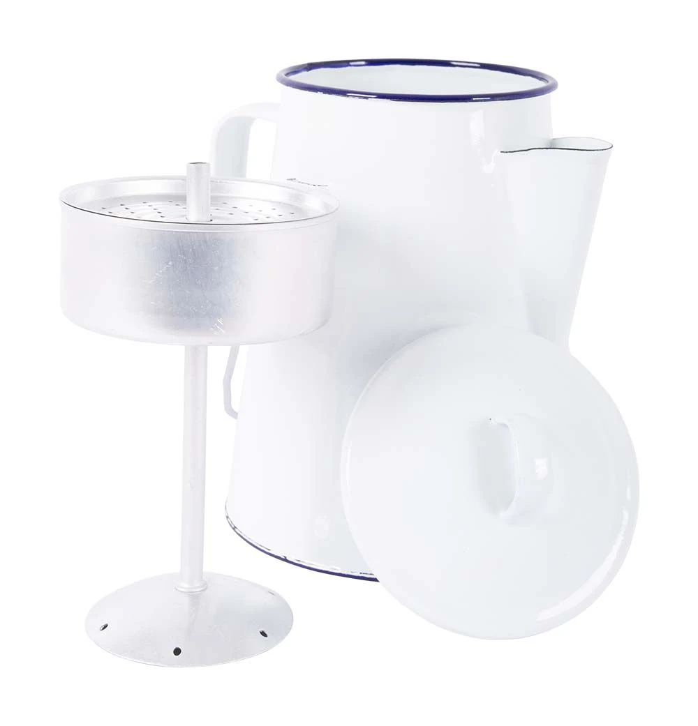 Een geëmailleerde theeketel. Deze theeketel heeft een emaille laag, deze harde laag zorgt voor extra hygiëne en stevigheid van het bord. Tevens is emaille hittebestendig en duurzaam. De theeketel is gedecoreerd met een blauwe rand.