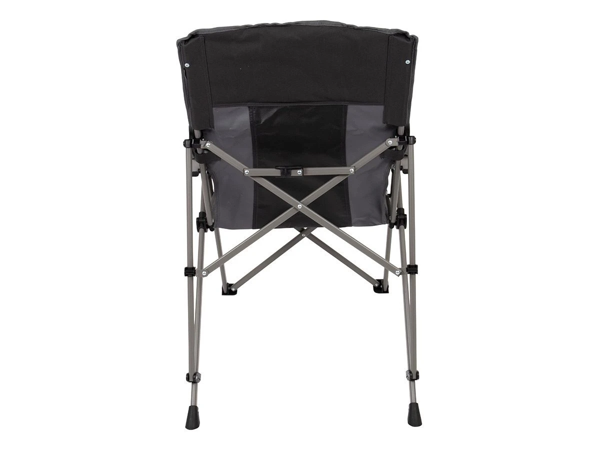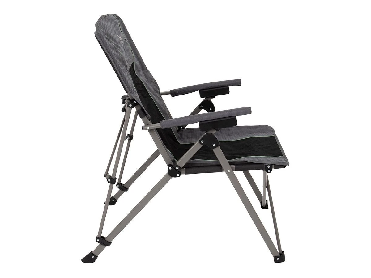 Het frame van de stoel is gemaakt van staal met daarop een stevige polyester zitting. Ook de armleggers zijn bekleed voor extra comfort. De stoel heeft een maximaal draagvermogen van 120 kg en wordt geleverd inclusief een handige draagtas.
