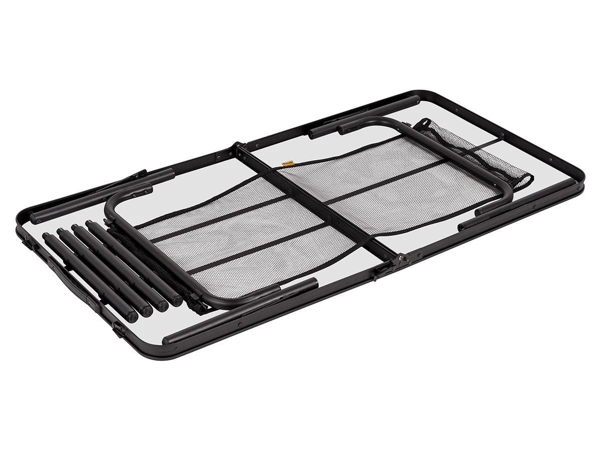 De afneembare tafelpoten zijn op te bergen onder het tafelblad, vervolgens is de tafel tot een compact pakket dubbel te klappen. Dankzij het handvat kun je de tafel makkelijk meenemen. Het zwarte frame is gemaakt van aluminium met daarop een MDF tafelblad. De tafel is dus niet bestand tegen water en hitte!