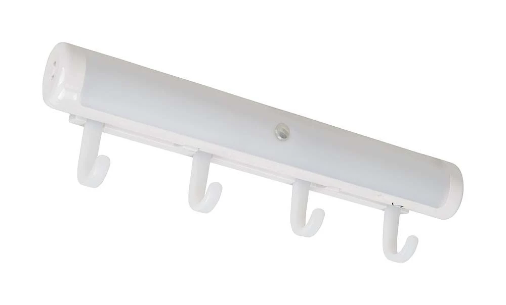 Een zeer handige sensor lamp met haakjes. Eenvoudig via de plakstrip aan de achterkant of met schroeven vast te maken aan een vlakke ondergrond, of verticaal op te hangen met de haak. Ideaal voor in een kastje in de caravan of camper. De haakjes hebben een maximale draagkracht van 1 kilo en zijn geschikt voor het ophangen van sleutels, tassen etc. Bij beweging voor de sensor springt de lamp aan. Heeft ook een stand waarbij het licht permanent aan of uit staat. Oplaadbaar met meegeleverde USB kabel.