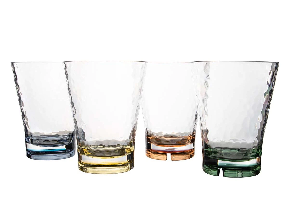 Een kleurrijke set limonade glazen uit de Pastel collectie. De 4 verschillende kleuren onderin het glas geven een speels en vrolijk effect. Het glas is kraswerend, van lichtgewicht en vaatwasmachinebestendig. Verder is deze gemaakt van zeer sterk kunststof en is BPA vrij.