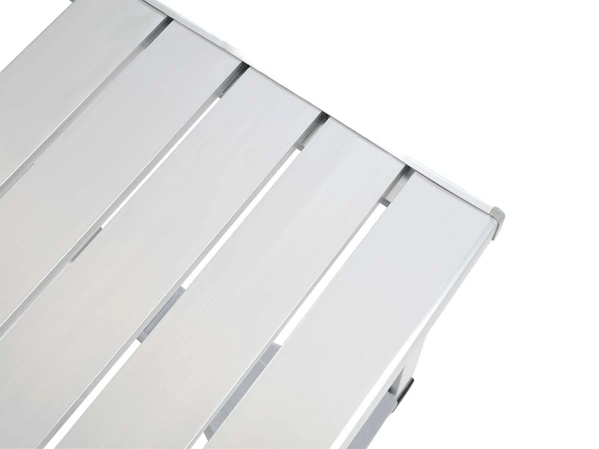 Zowel het frame, de zitting en het tafelblad zijn gemaakt van lichtgewicht aluminium, hierdoor is de picknicktafel waterproof en hittebestendig. Het zitgedeelte is 41 cm hoog en het tafelblad beschikt over een parasolgat. Het maximale draagvermogen per zitting is 70 kg.