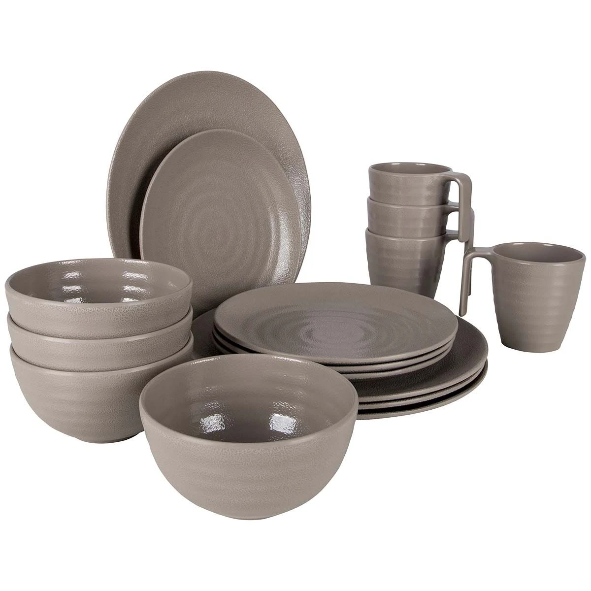 Een 16-delig servies van 100% melamine met een mooi design. Melamine servies is vrijwel onbreekbaar en zeer licht van gewicht. Daarnaast is het servies kraswerend en vaatwasmachinebestendig. Deze stijlvolle set is geschikt voor 4 personen en bestaat uit 4 borden, 4 ontbijtbordjes, 4 kommen en 4 mokken. Afmetingen: Ø Bord: 26,6 cm. Ø Ontbijtbord: 21 cm. Ø Kom: 13,5 cm en Ø Mok: 11,85 cm.