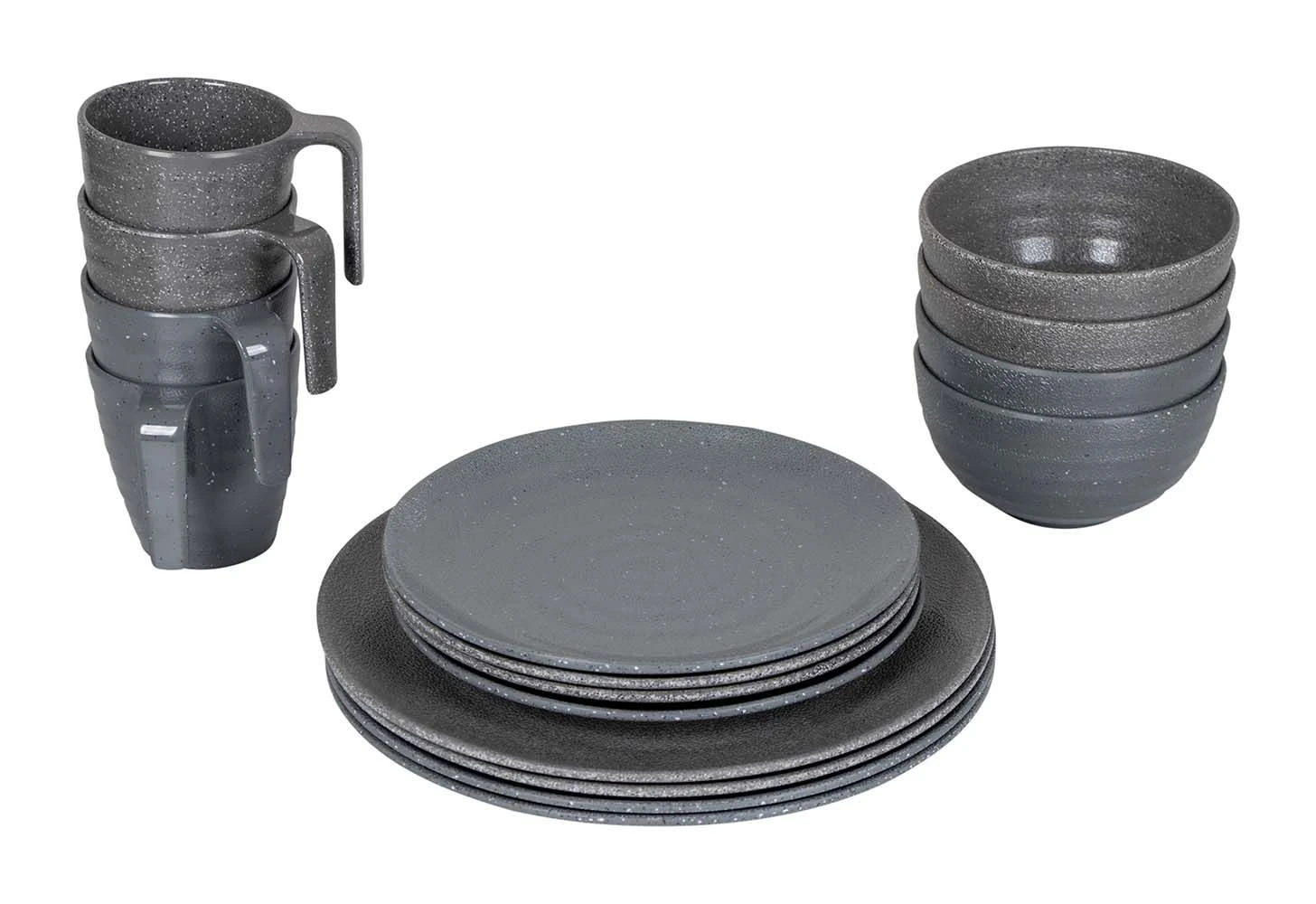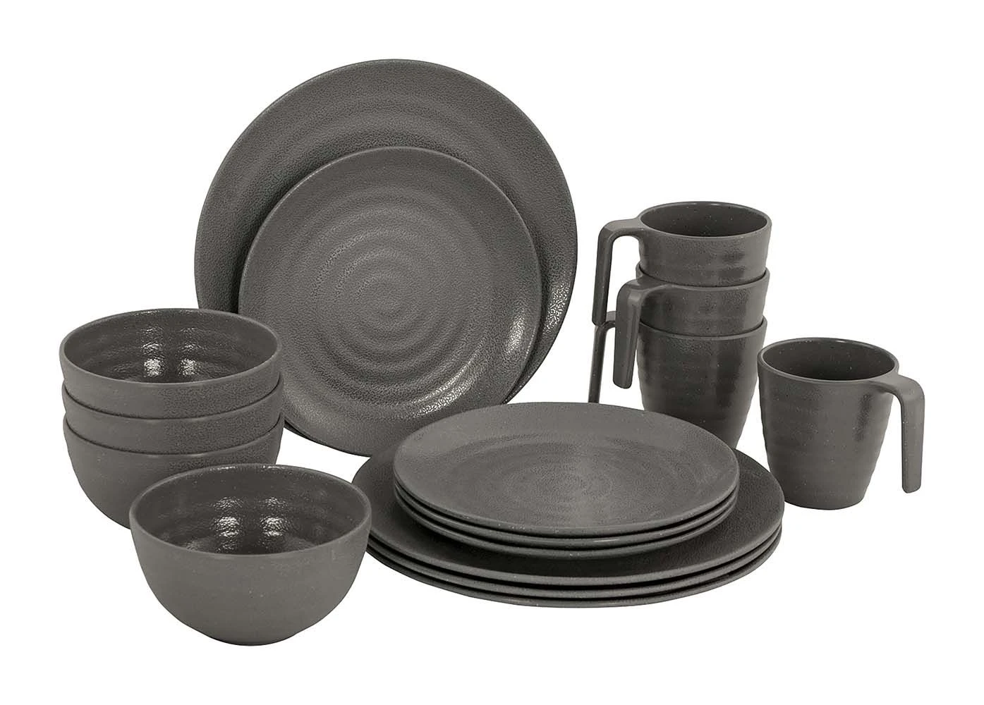 Een 16-delig servies van 100% melamine met een mooi design. Melamine servies is vrijwel onbreekbaar en zeer licht van gewicht. Daarnaast is het servies kraswerend en vaatwasmachinebestendig. Deze stijlvolle set is geschikt voor 4 personen en bestaat uit 4 borden, 4 ontbijtbordjes, 4 kommen en 4 mokken. Afmetingen: Ø Bord: 26.6 cm. Ø Ontbijtbord: 21 cm. Ø Kom: 13.5 cm en Ø Mok: 11.85 cm.